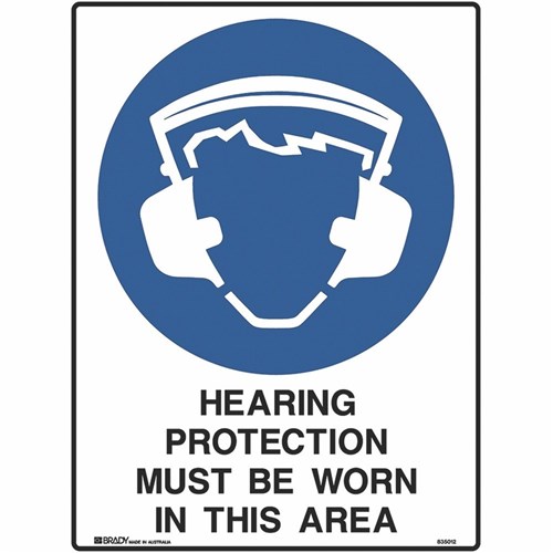 Brady Mandatory Sign Hearing Protection Must Be Worn 450W x 600mmH Metal White/Blue