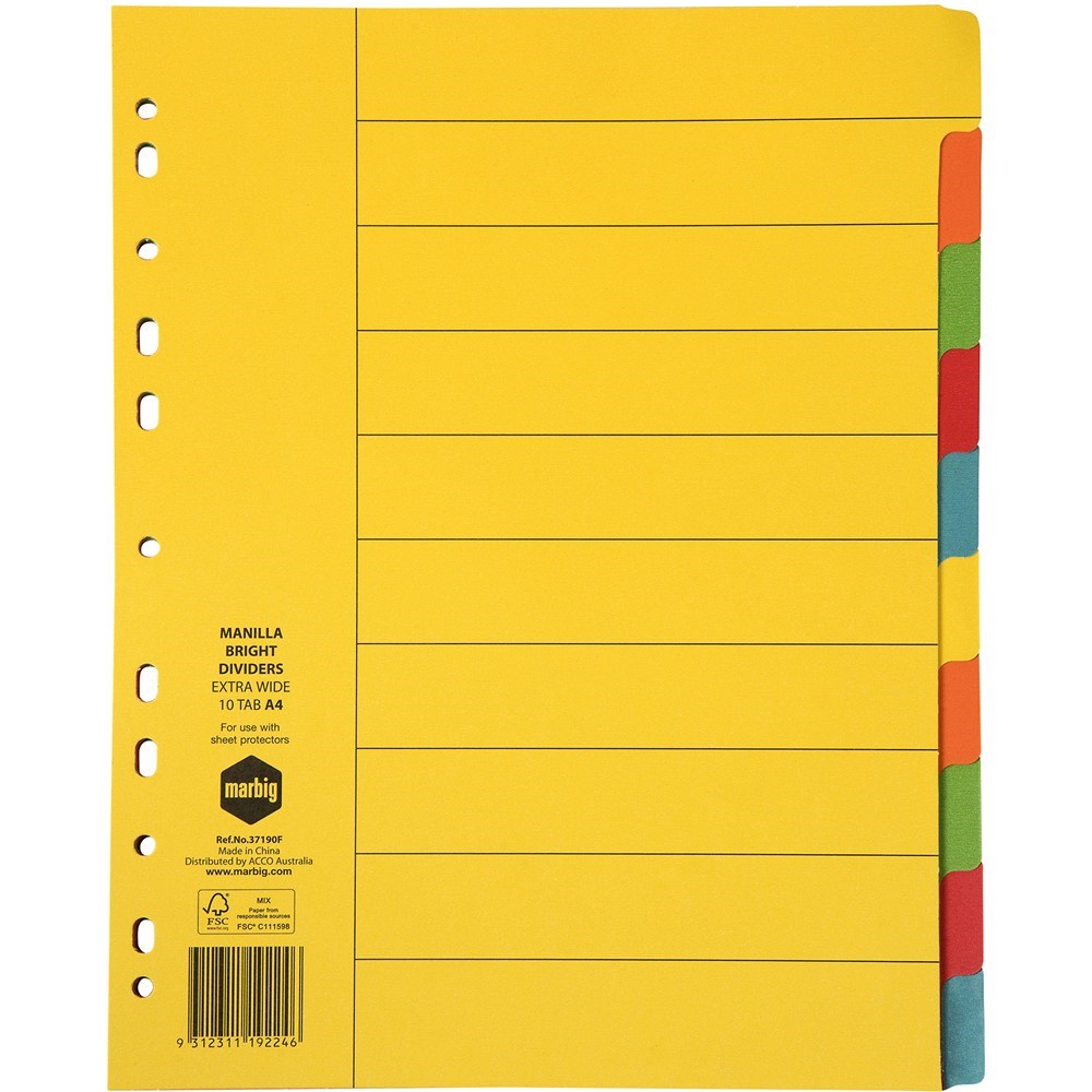 Marbig Manilla Indices & Dividers A4 Extra Wide 10 Tab Bright Colours