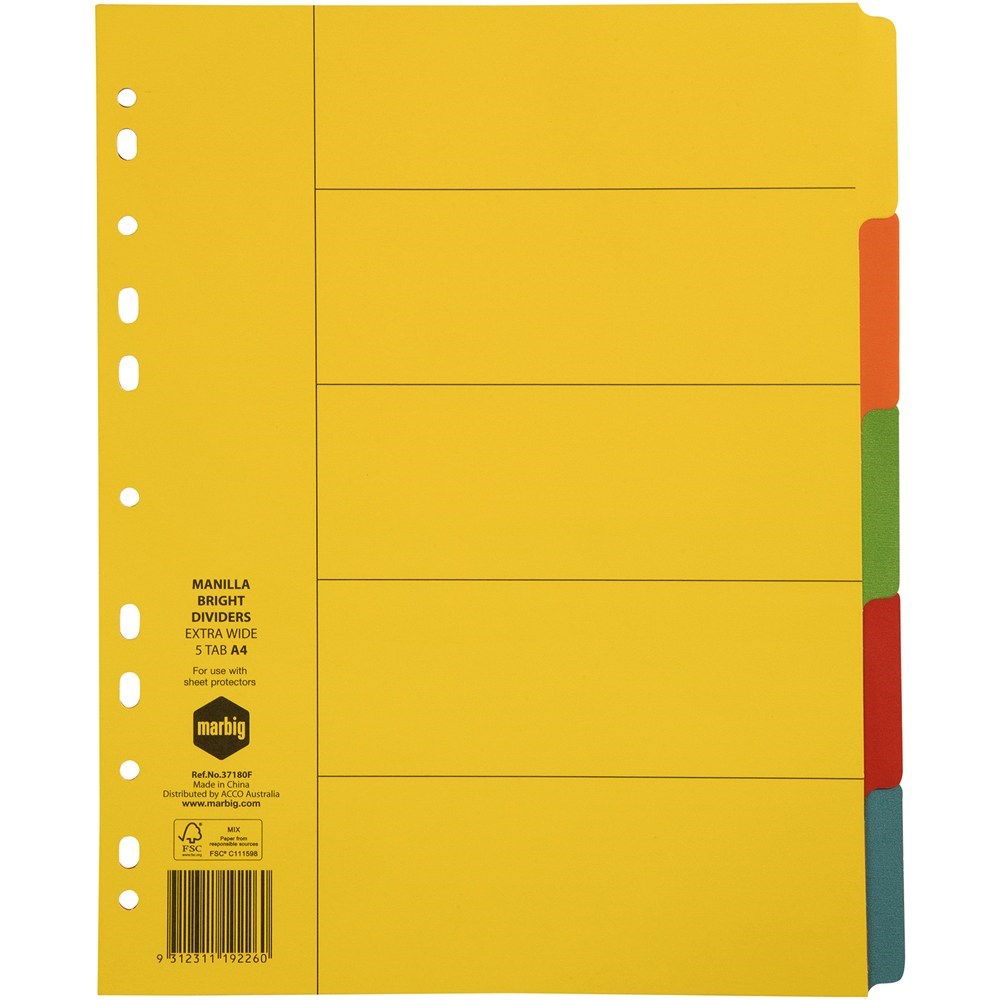 Marbig Manilla Indices & Dividers A4 Extra Wide 5 Tab Bright Colours